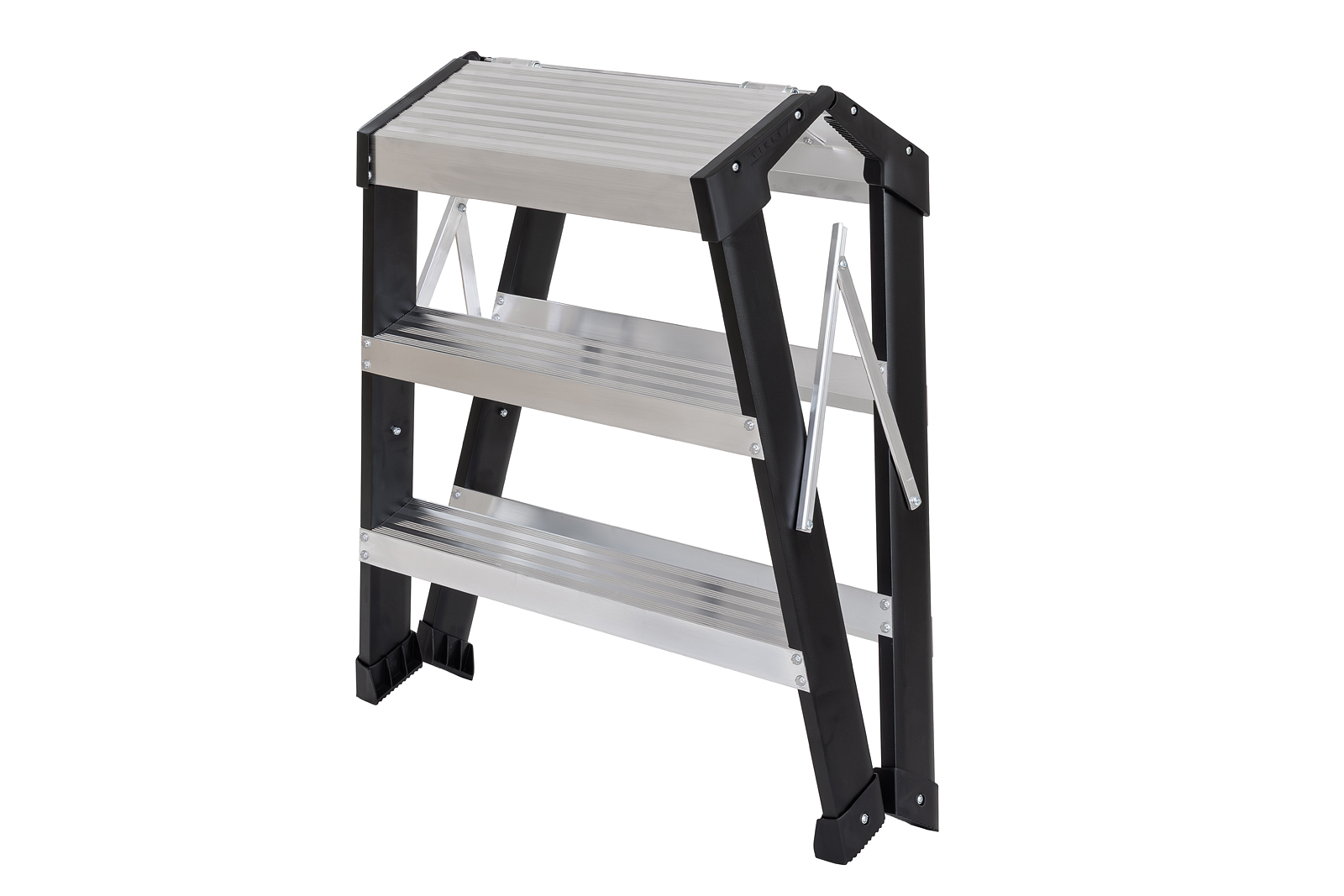 The wide, grooved steps are secured using durable FDS (Flow Drilling Screws) friction-welded joints. This advanced fastening method ensures long structural durability. Together with the flared side profiles, the work platform offers excellent stability in use.