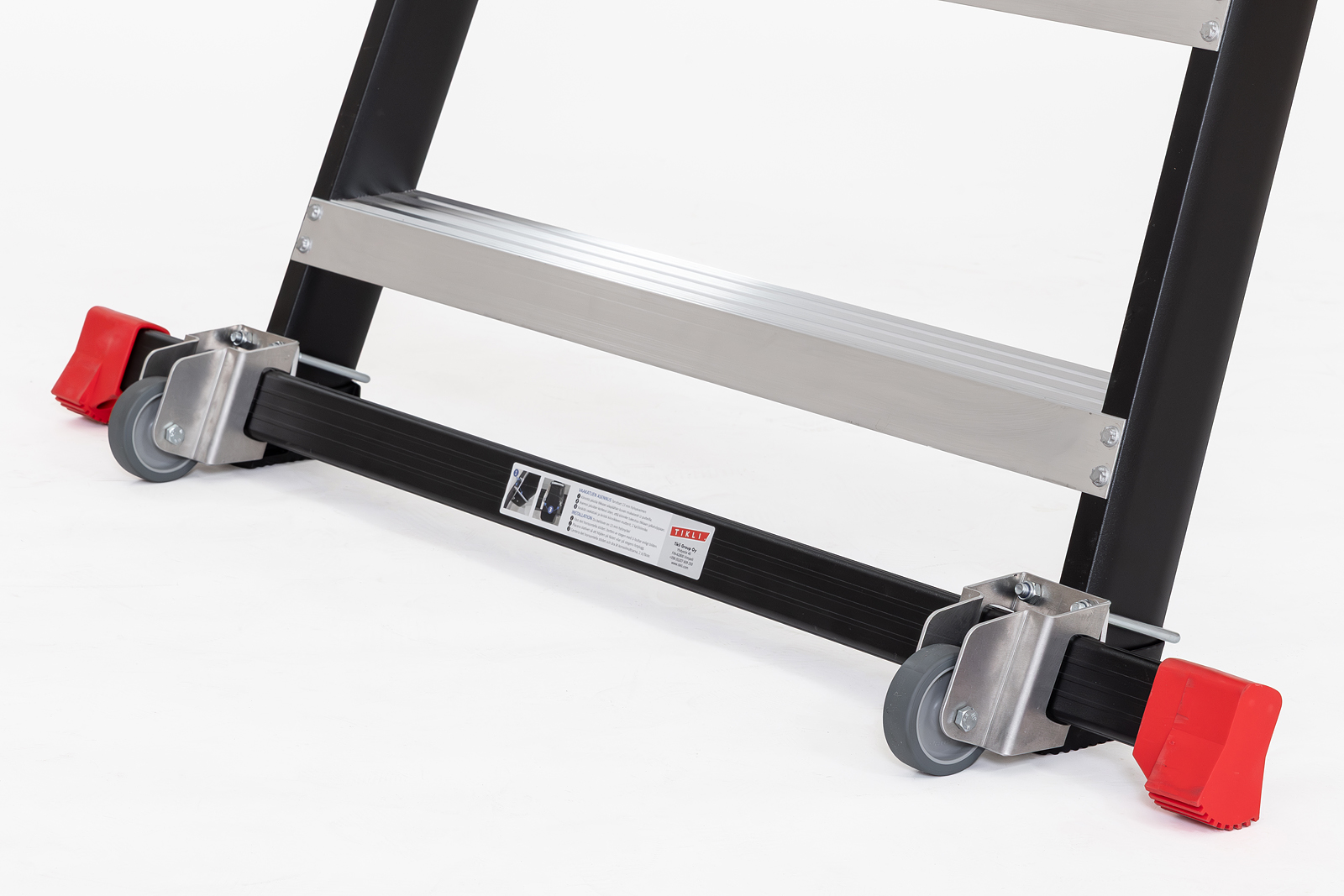 Vakaa ja tasokas ammattitasotikas vaativaan käyttöön. Uritettu, suuri alumiininen seisontataso (400 x 400) mm on suunniteltu soveltumaan myös kookkaammille turvakengille ja niiden käyttäjille tehden pitkäkestoisesta työskentelystä vakaampaa ja miellyttävämpää. Leveät uritetut askelmat on kiinnitetty kestävällä liitostekniikalla FDS- kitkahitsausruuveilla (Flow Drilling Screws). Uusi liitostekniikka takaa rakenteelle pitkän käyttöiän ja yhdessä sivuprofiileiden levenevän harituksen sekä vaakatukien kanssa tasotikas on erittäin vakaa käyttää. Korkea käsituki, tilava alumiininen työkalukotelo sekä ergonominen työskentelyasento lisäävät myös työturvallisuutta. Musta struktuurimaalipinta on siisti käsitellä, ei sotke käsiä. Liukuesteissä on huomioitu erinomainen kitka ja kulutuskestävyys, tassut ovat myös helposti vaihdettavissa.